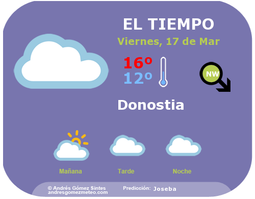Por lo tanto hoy calor y fin de semana con bastante nubosidad mas claros el Domingo viento norte flojo y temperaturas máximas de unos 15Cº a la espera de cambios para mediados de la próxima semana.